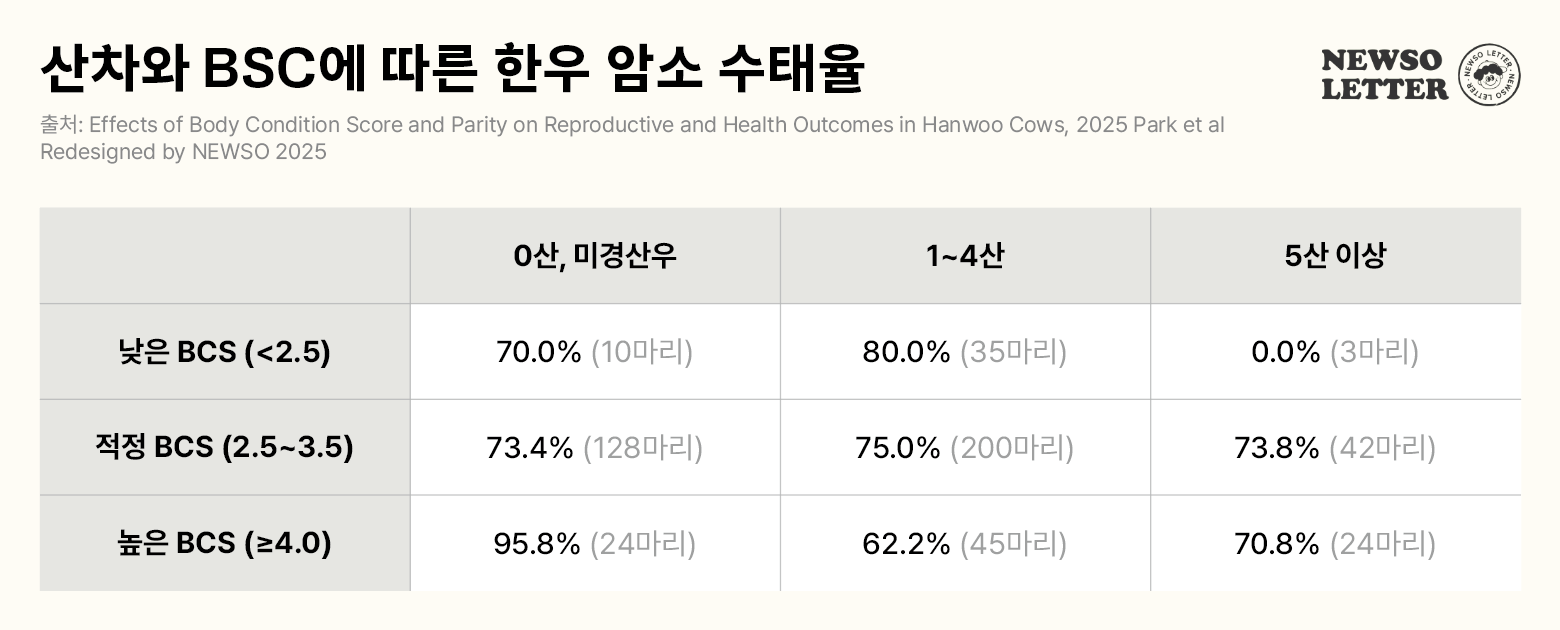 연구팀이 511마리의 한우 암소를 산차(미경산, 1~4산, 5산 이상)와 BCS(낮음: 2.5 미만, 적정: 2.5~3.5, 높음: 4.0 이상)에 따라 그룹을 나누어 수태율과 건강지표들을 분석해본 결과,