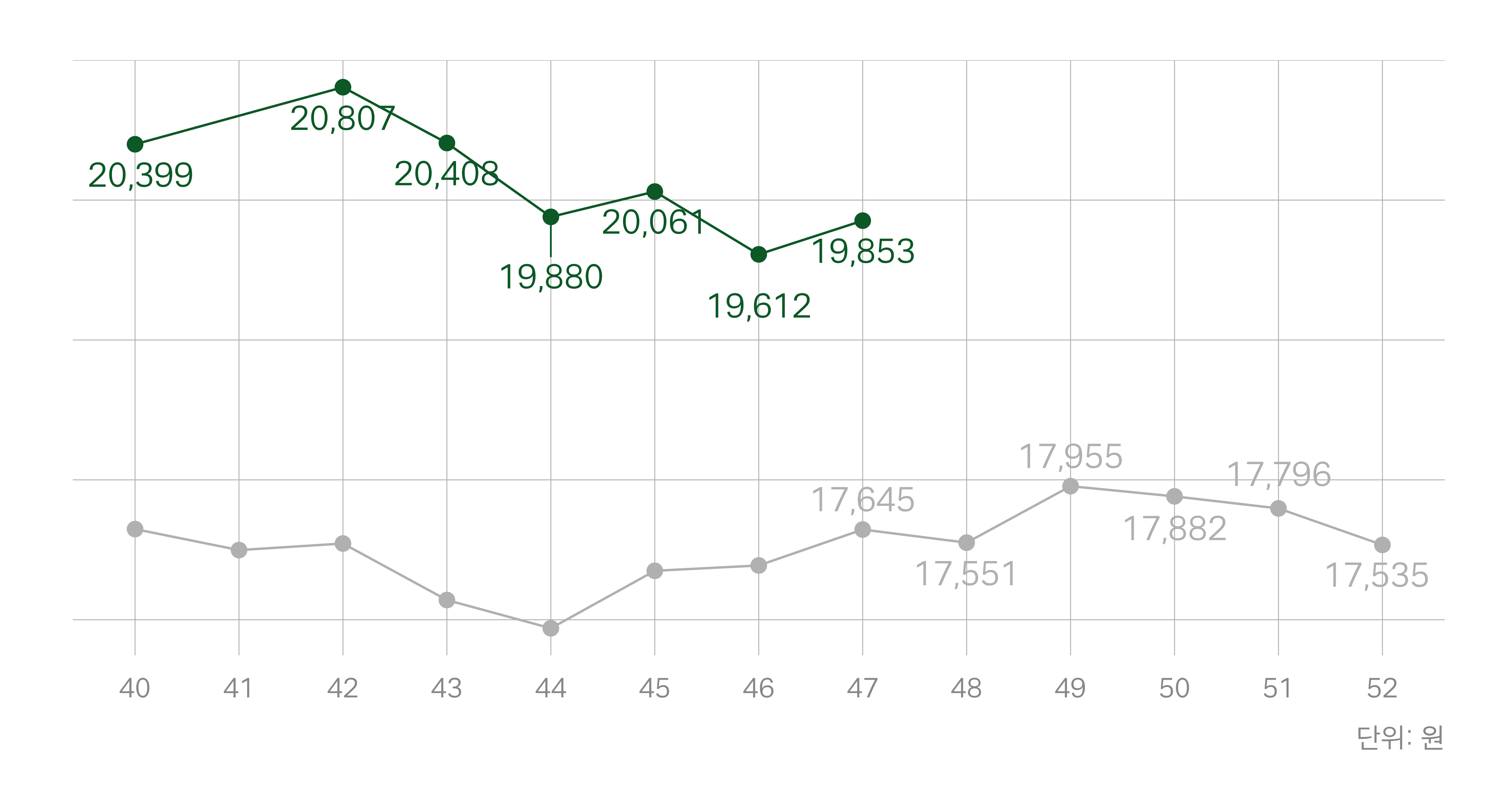 뉴소레터는 매주 목요일에 발행하기 때문에 이번 주 한우 지육 가격은 화~수요일 총 2일로 계산해요. 지난주 평균을 계산할 때는 화~금요일 총 4일의 가격이 포함되기 때문에 같은 주차여도 발행일에 따라 가격이 다를 수 있어요. (월요일 가격은 평균 산정에서 제외)