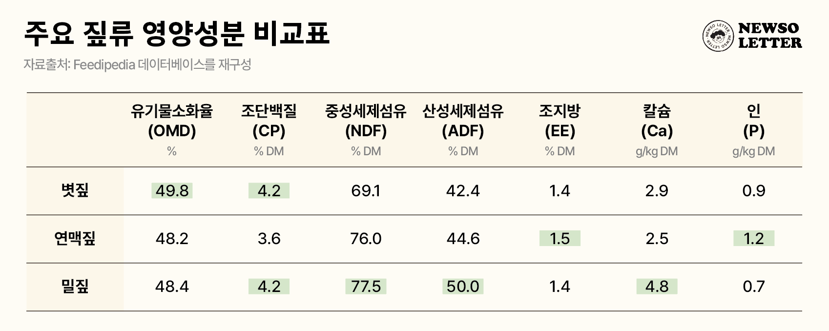 - 볏짚: 가장 흔하지만 단백질 함량이 낮고, 소화율이 낮아요. 따라서 반추위 기능과 산도(pH)를 유지하거나 부피감을 주는 구조적 역할에 효과적으로 사용할 수 있어요.