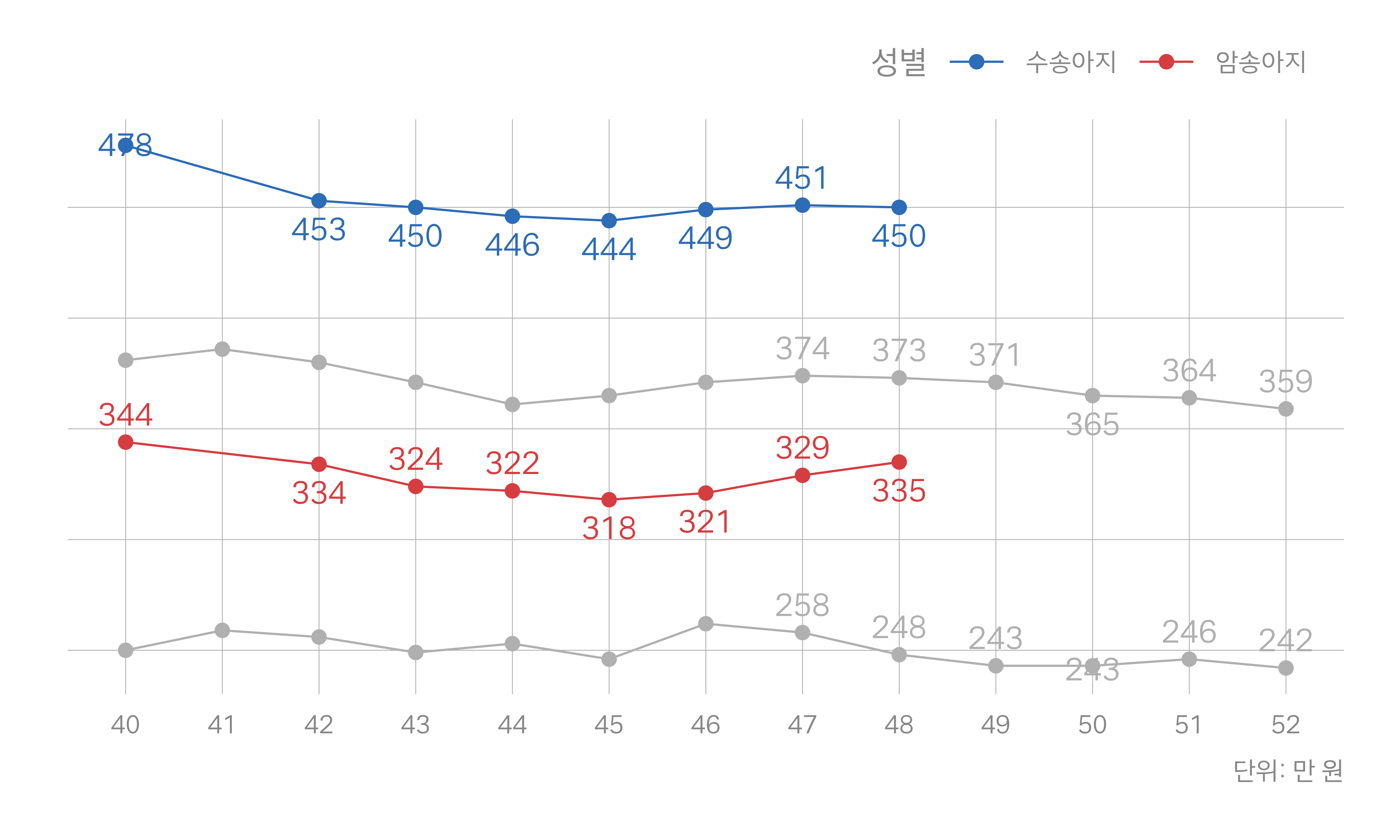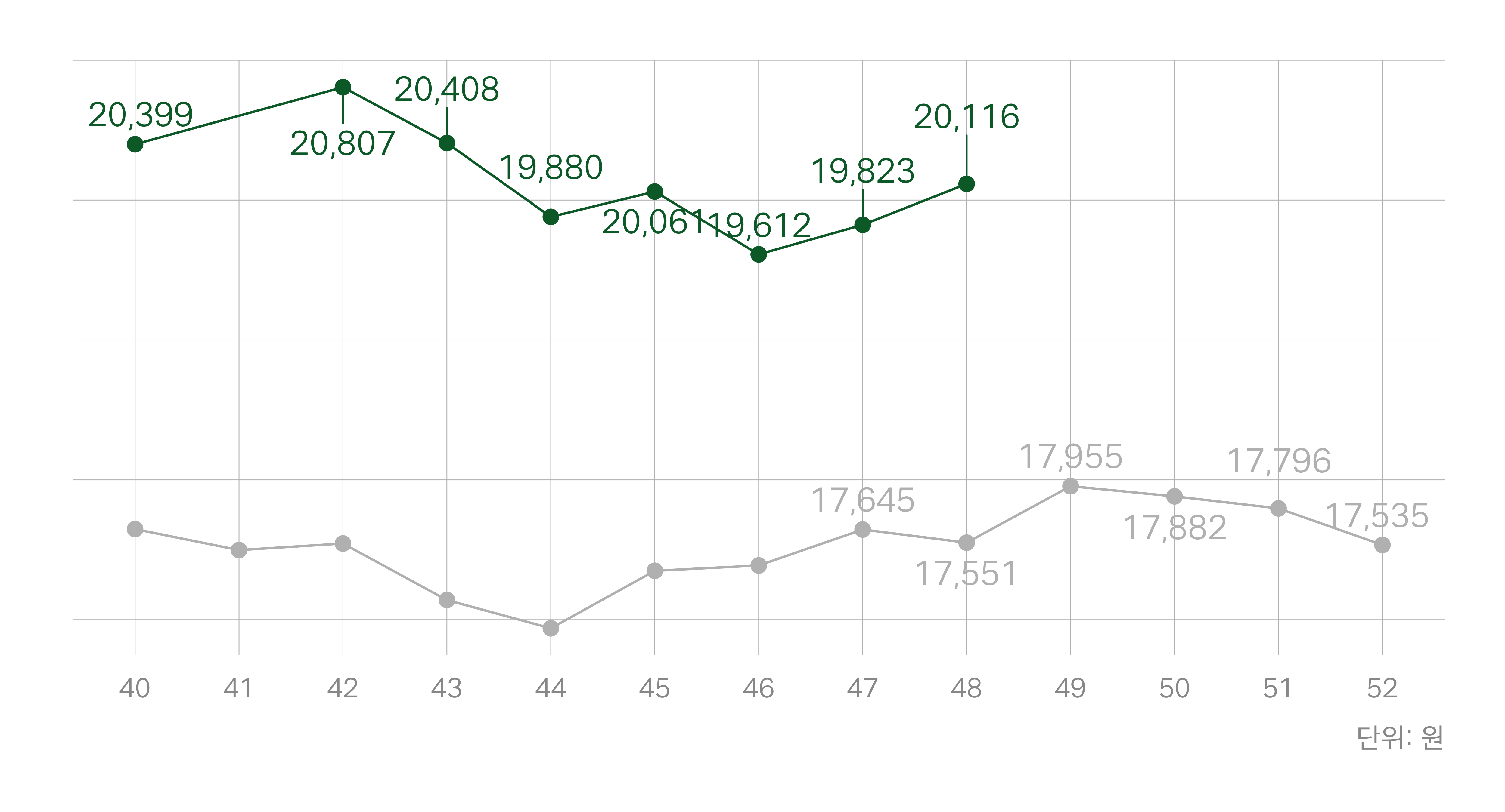 회색 선: 지난해 동일 주차 |
