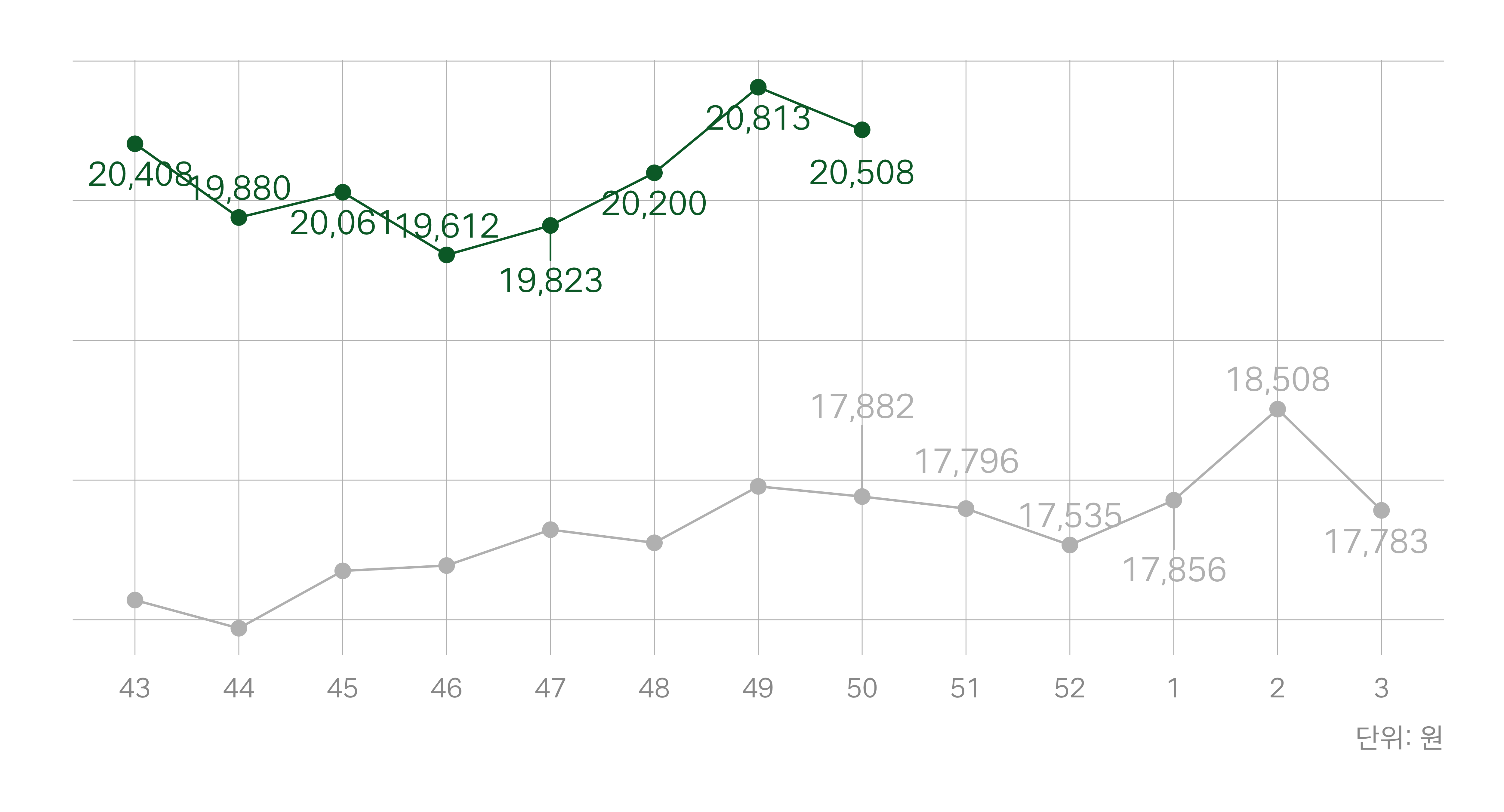 회색 선: 지난해 동일 주차 |
