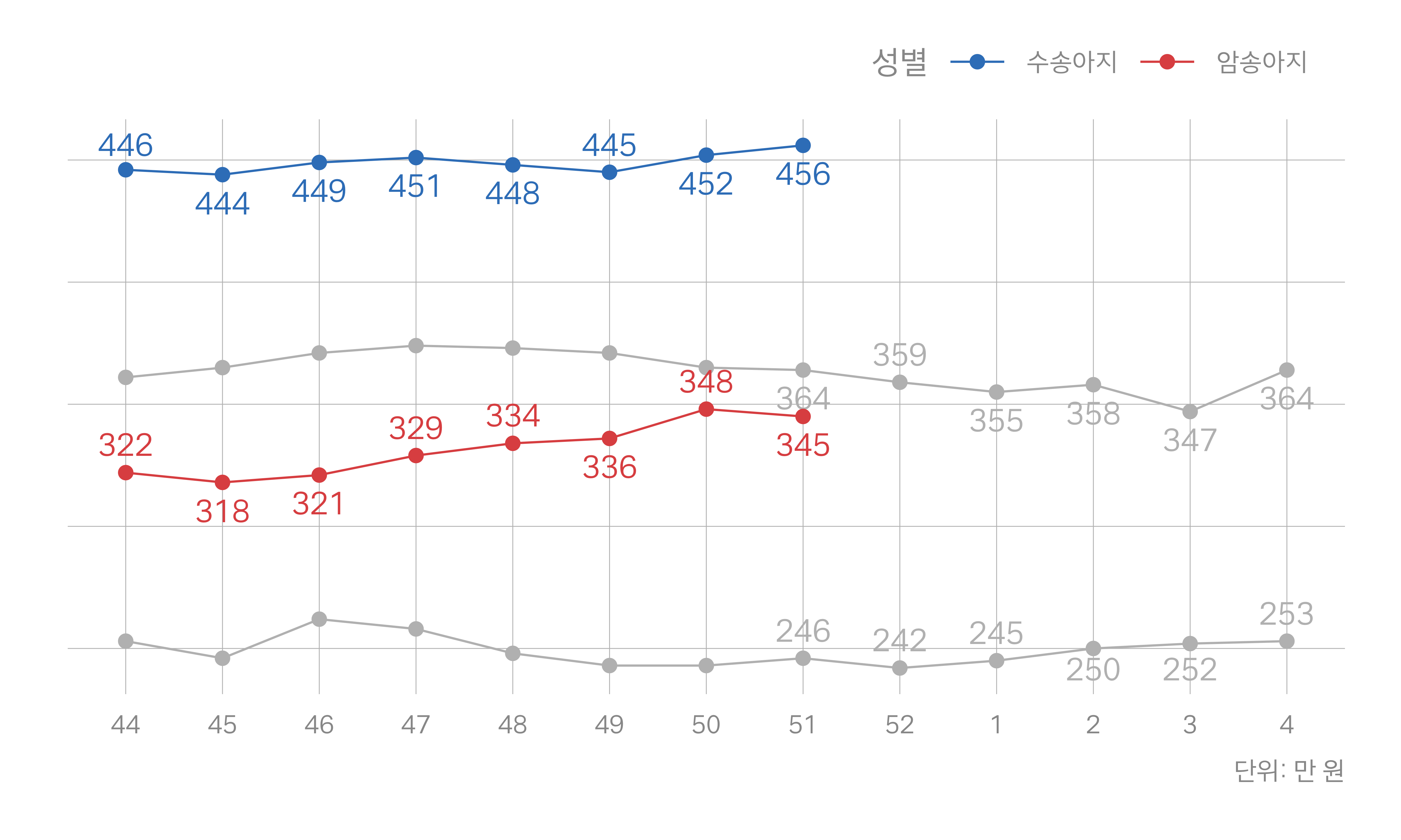 회색 선: 지난해 동일 주차 |