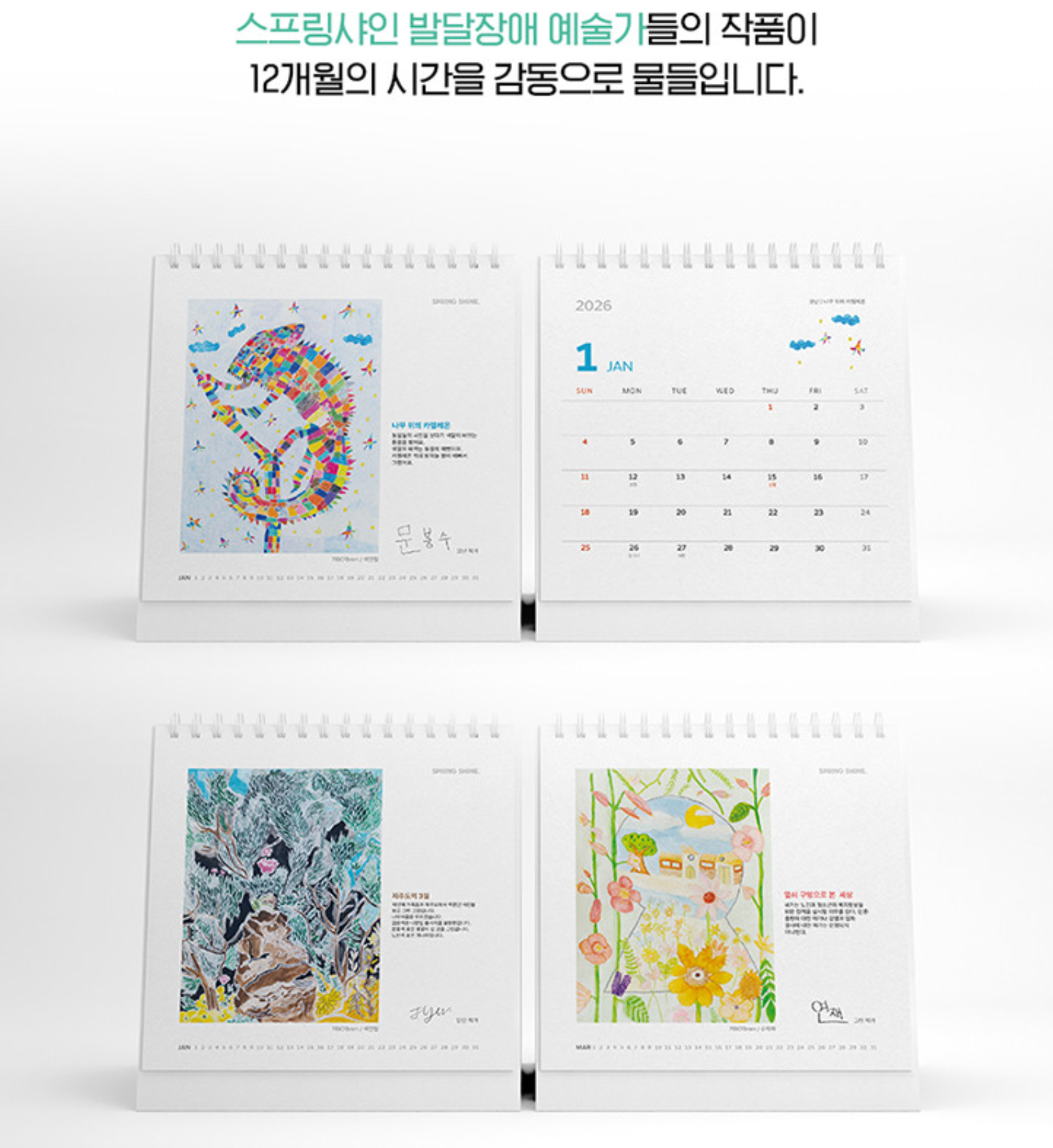 이번 이벤트 경품인 <2026 스프링샤인 아트 캘린더>는 발달장애인 예술가가 직접 그린 작품으로 만든 달력이에요. 세상을 다른 시선으로 바라보는 스프링샤인 소속 예술가 9인의 감정과 마음을 담은 작품이 수록되어 있어요 . 제품을 자세하게 보고 싶으신 분들은 여기를 참고해주세요.