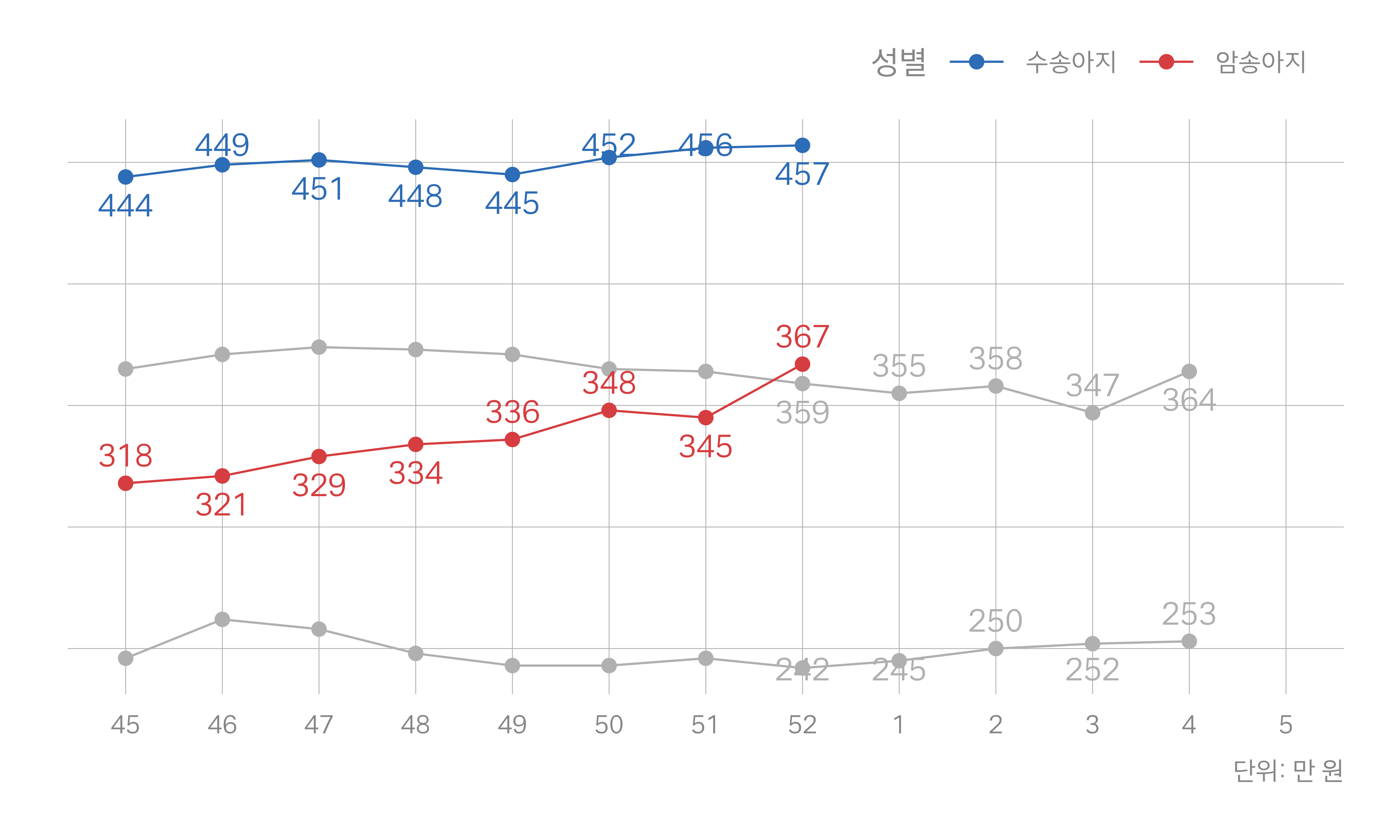 회색 선: 지난해 동일 주차 |
