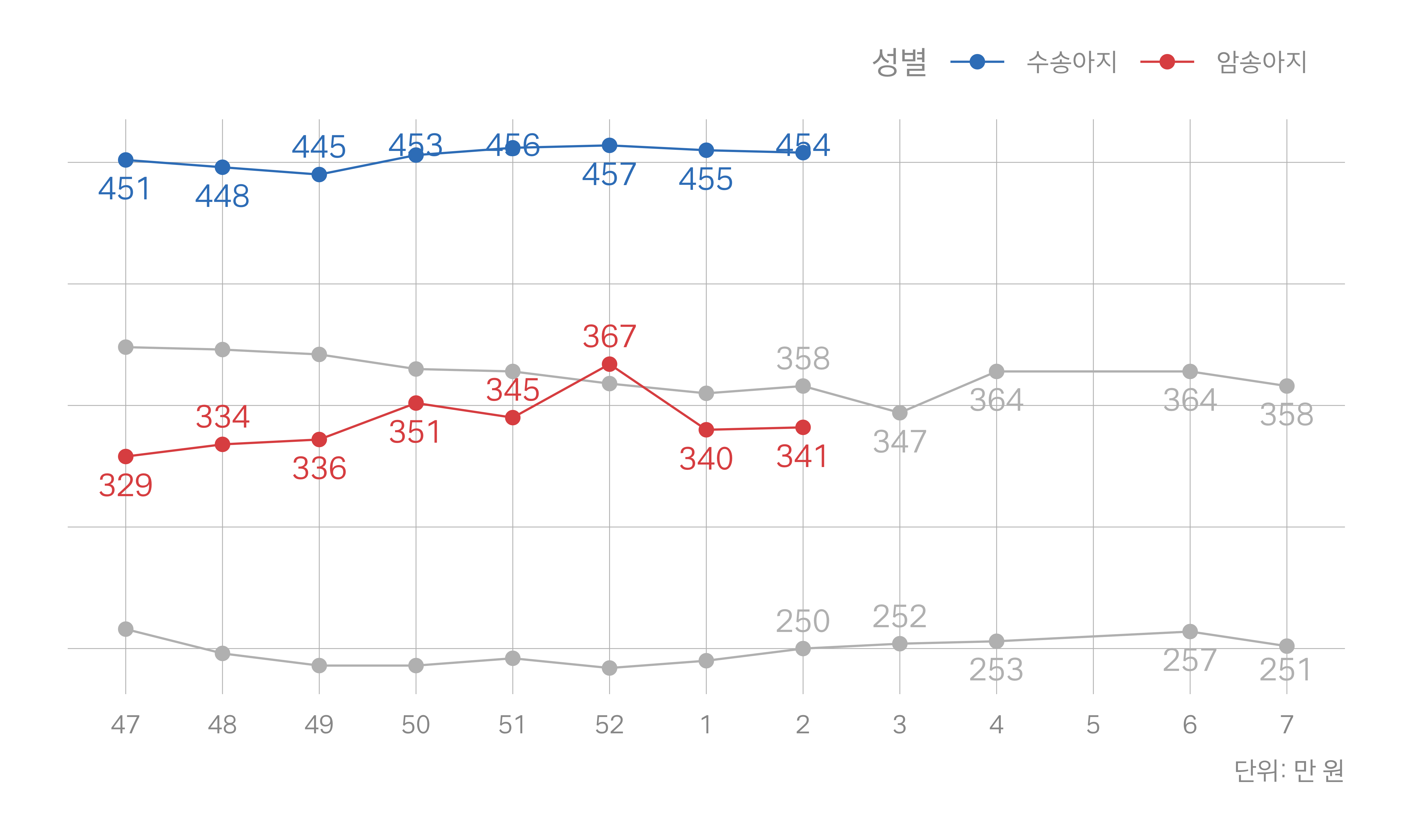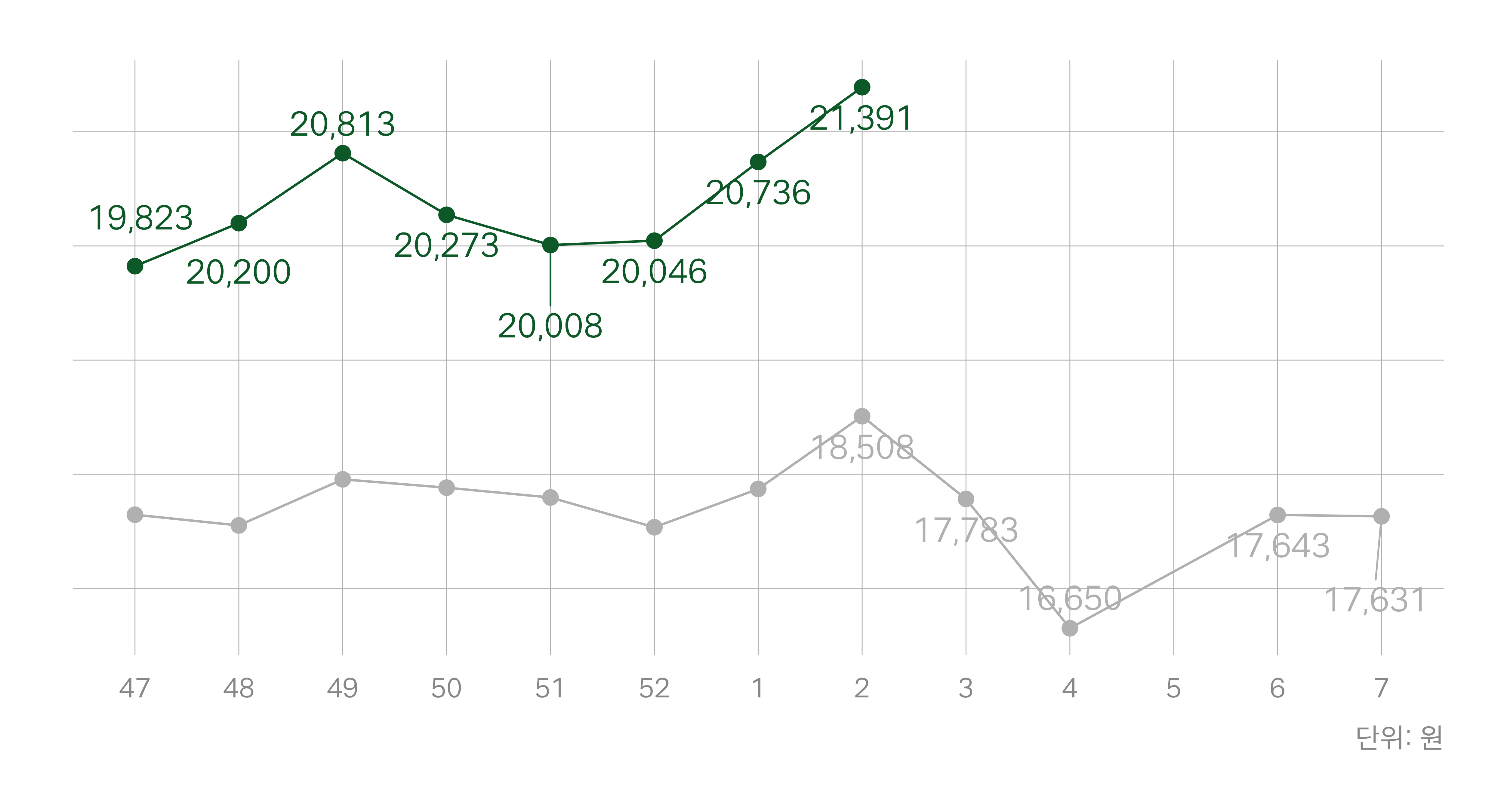 뉴소레터는 매주 목요일에 발행하기 때문에 이번 주 한우 지육 가격은 화~수요일 총 2일로 계산해요. 지난주 평균을 계산할 때는 화~금요일 총 4일의 가격이 포함되기 때문에 같은 주차여도 발행일에 따라 가격이 다를 수 있어요. (월요일 가격은 평균 산정에서 제외)