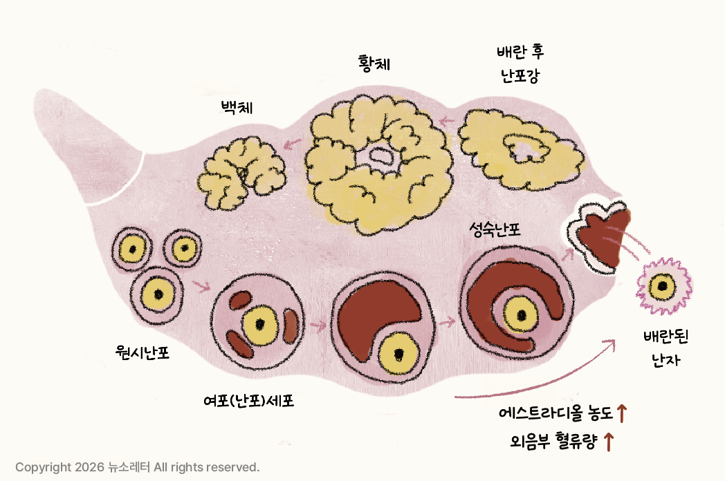 난포 발달 과정이 생소하신 분들을 위해 잠시 설명 드리자면, 난자는 원시 난포에서 점차 성숙해요. 성숙 중인 난포는 에스트라디올을 분비하고, 이 호르몬은 발정 직전에 가장 높아지고요. 배란이 일어나면 난자가 있던 자리는 황체로 바뀌고, 이 황체가 프로게스테론을 분비해 임신이 가능한 환경을 유지한다고 해요. 만약 임신이 되지 않으면 황체가 퇴화하면서 프로게스테론 농도가 떨어지고, 새로운 발정 주기가 시작되는 거예요.