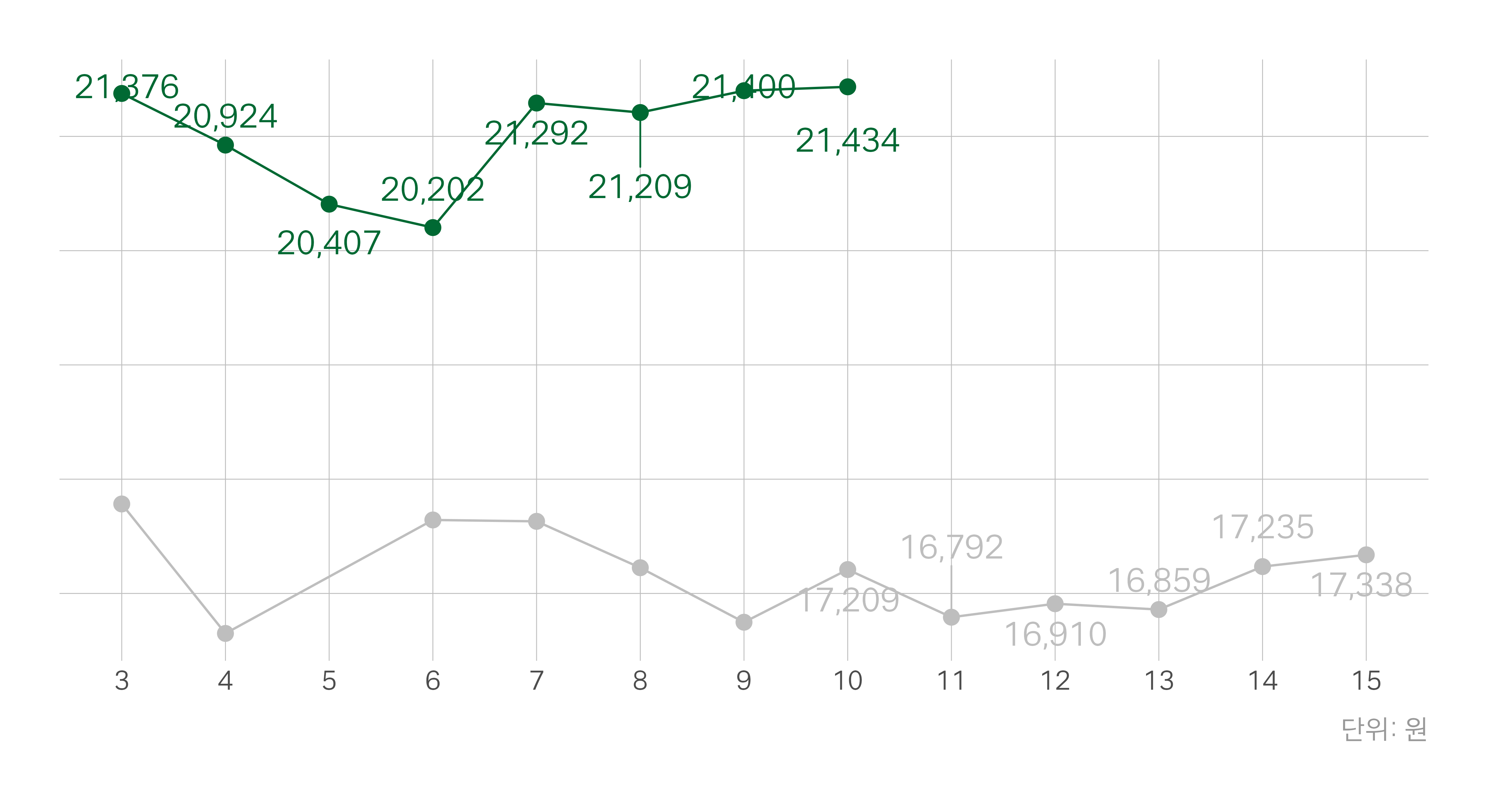 뉴소레터는 매주 목요일에 발행하기 때문에 이번 주 한우 지육 가격은 화~수요일 총 2일로 계산해요. 지난주 평균을 계산할 때는 화~금요일 총 4일의 가격이 포함되기 때문에 같은 주차여도 발행일에 따라 가격이 다를 수 있어요. (월요일 가격은 평균 산정에서 제외)