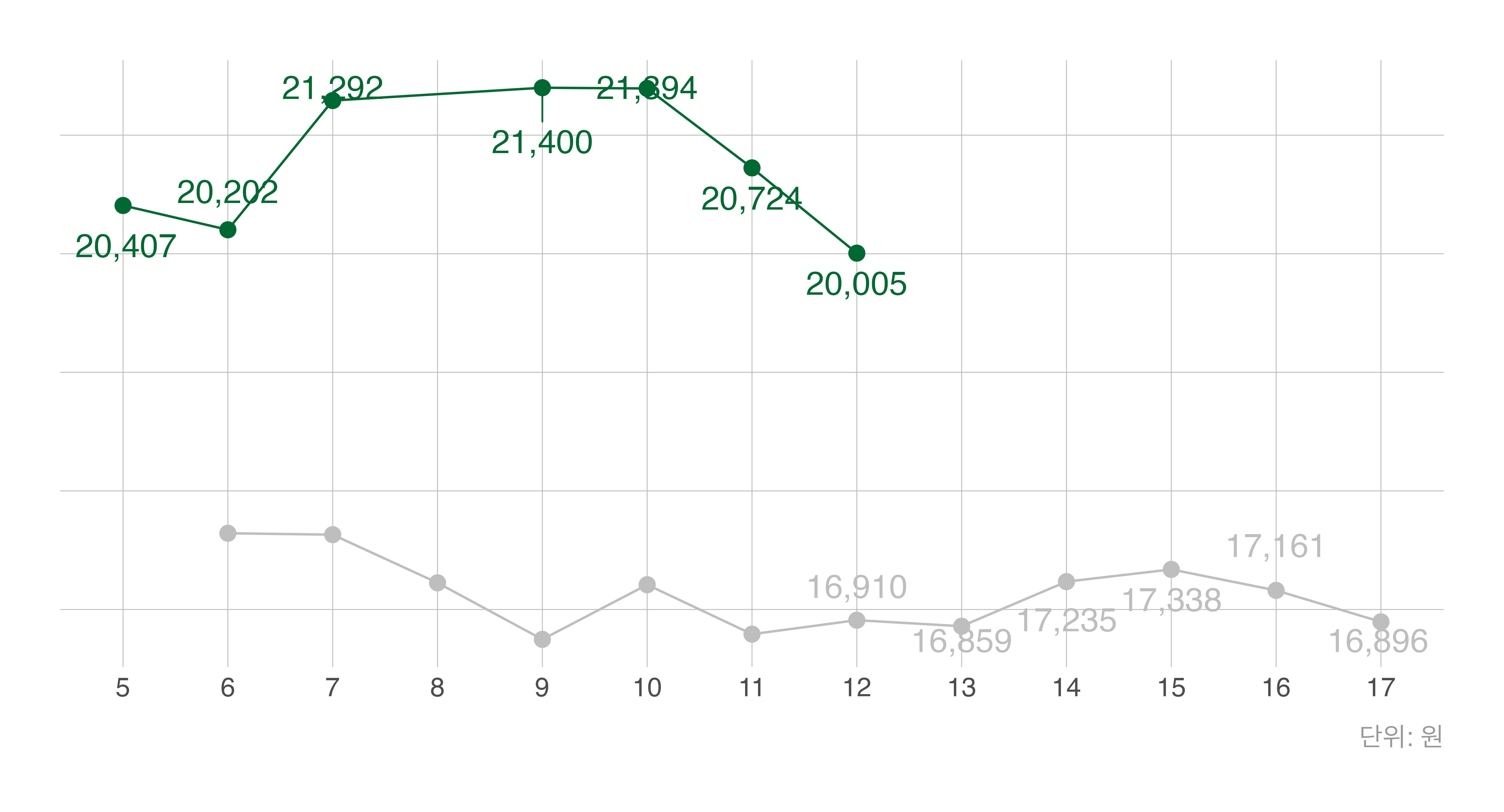 회색 선: 지난해 동일 주차 |