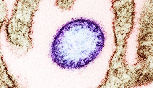 니파바이러스(보라색)에 감염된 세포(갈색) 사진 (출처: 위키피디아) |