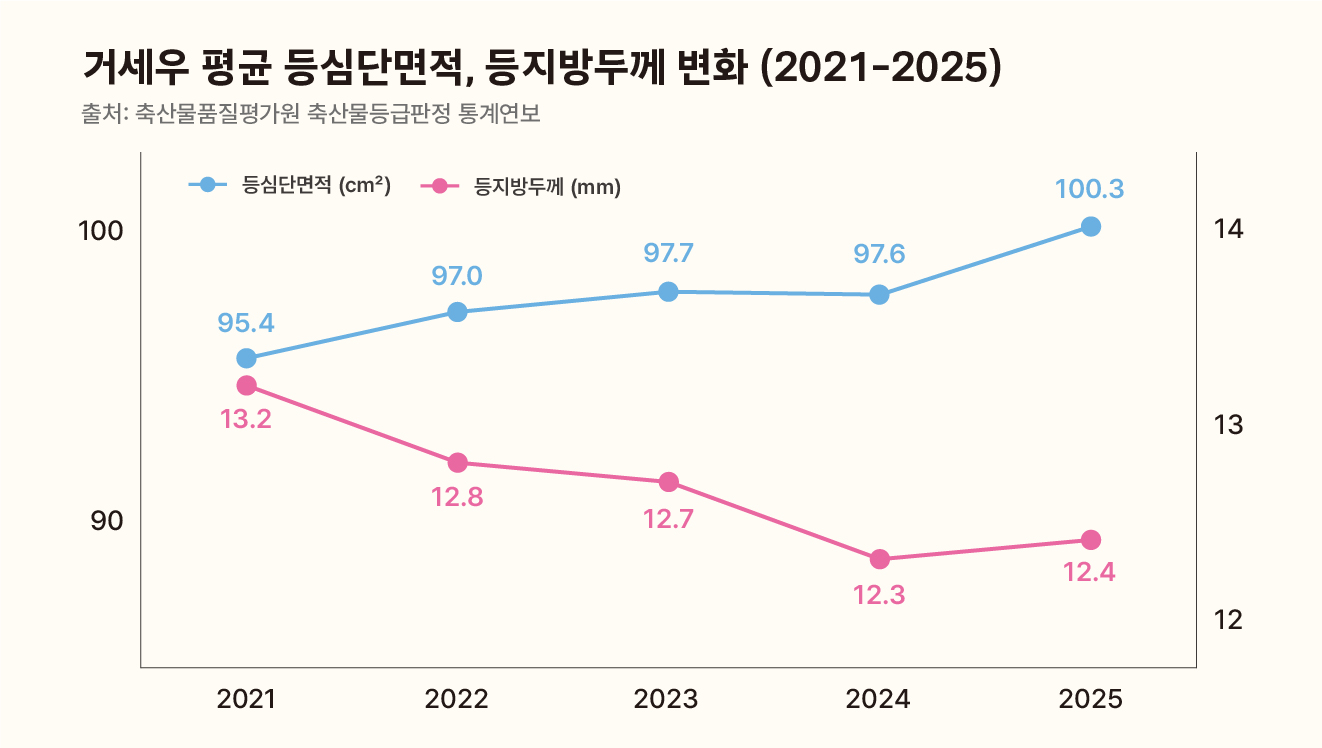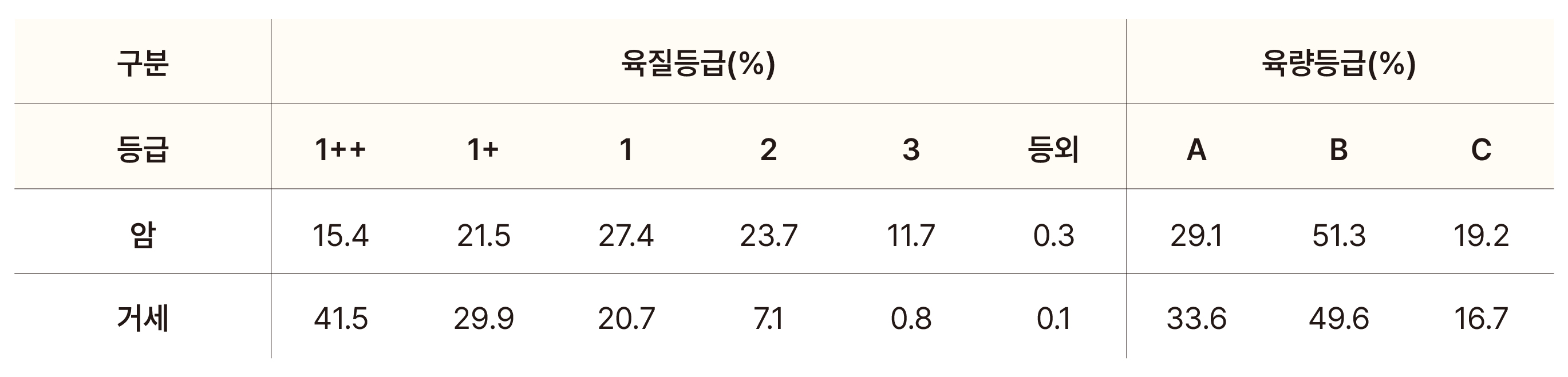 거세우 기준으로 보자면, 1등급 이상 출현율이 가장 높았던 곳은 제주(94.3%), 등지방두께가 가장 얇았던 곳은 서울(7.3mm), 등심단면적은 대전(104.5cm²)이 가장 넓었어요. 도체중량은 경북(486.3kg), 근내지방도는 인천/경남/제주(6.6점)가 으뜸이었고요. 이밖에도 원문에는 더욱 다양하고 자세한 통계자료들이 나와 있으니 관심 있으신 분들은 꼭 원문을 참고해보세요!