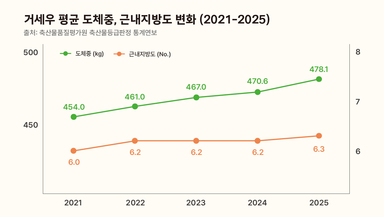 한우 거세우의 1+ 이상 출현율은 71.4%(▲2.5%p)였고, C등급 출현율은 16.7%(▼2.1%p)였어요. 거세우 평균 도체중은 478.1kg이었고, 거세우 평균 등심단면적은 100.3cm²(▲2.7cm²)로 지난 해보다 늘어났어요. 아래는 지난 5년간(2021-2025) 거세우 도체 형질과 평균 출하개월령, 등급 출현율이 어떻게 변했는지 보여주는 그래프예요. |
