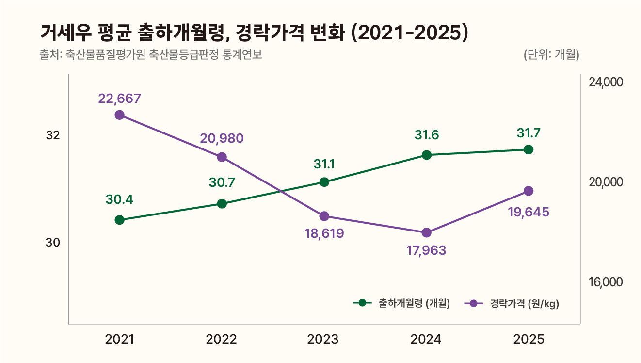 지난해 암소 평균 출하월령은 53.2개월(▼0.2개월), 거세우는 31.7개월(▲0.1개월)이었어요. 한우 도체 평균 경락가격은 18,482원/kg으로 2024년보다 2,000원 올랐는데요. 1+ 등급 경락 가격은 18,924원/kg(▲1,712원), 3등급 가격은 12,044/kg(▲2,237원)으로 모든 등급에서 2024년보다 가격이 오른 것을 알 수 있어요. 다만 가격 상승 폭은 등급이 높아질수록 줄어들었어요.