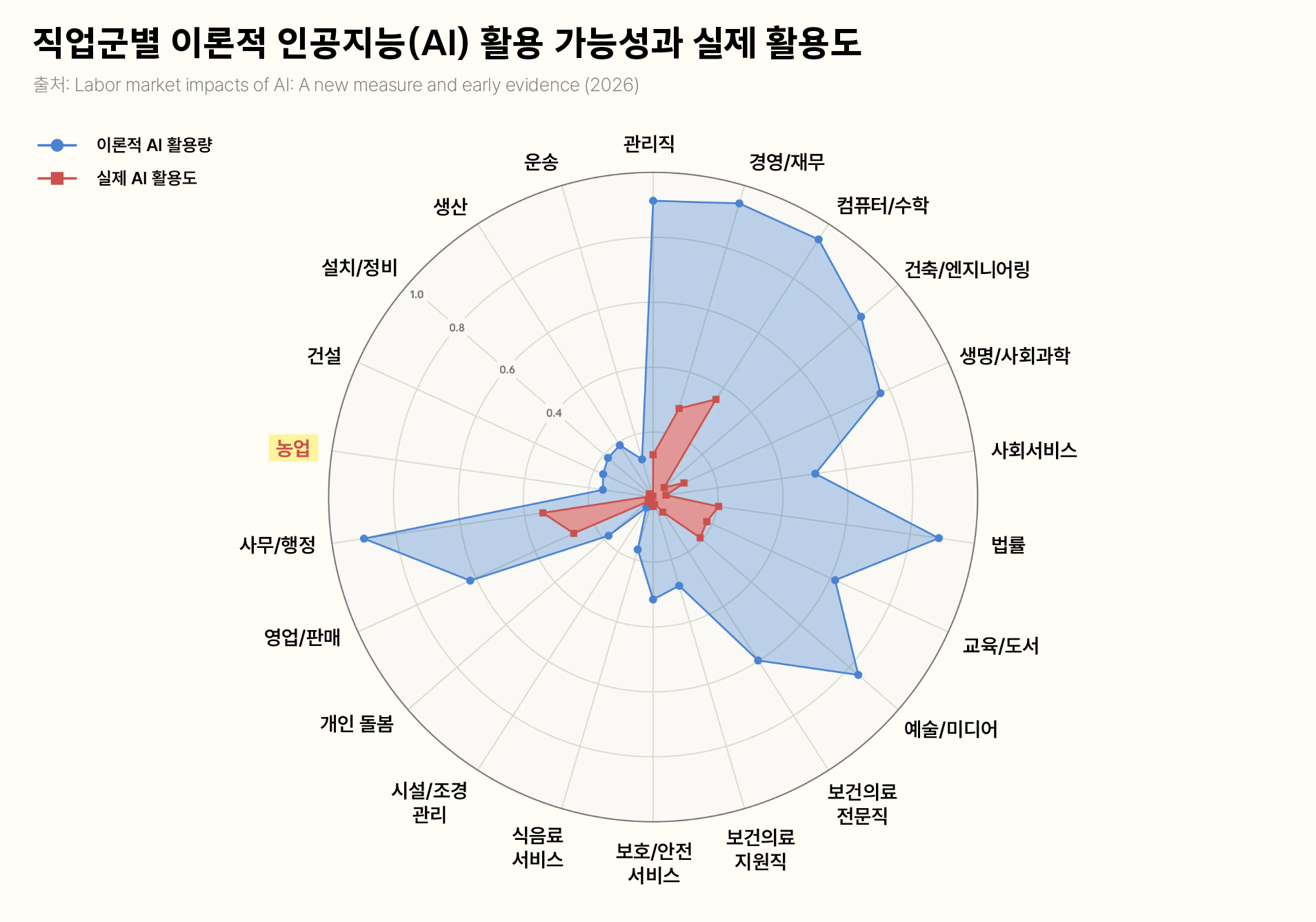 아래 이미지는 직업군별 인공지능의 이론적 사용량과 실제 사용량의 차이를 나타내는데요. 파란 부분만큼 AI가 대체할 수 있는 잠재력이 있지만, 클로드에서 실제로 사용되고 있는 부분은 붉은 부분에 불과했다고 해요 |